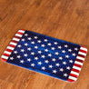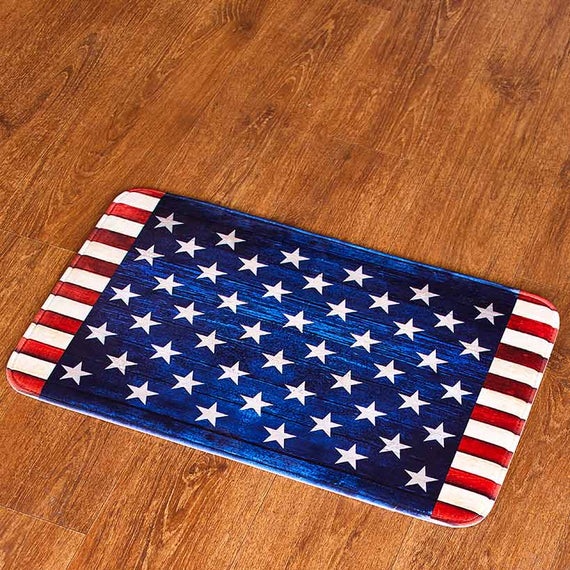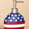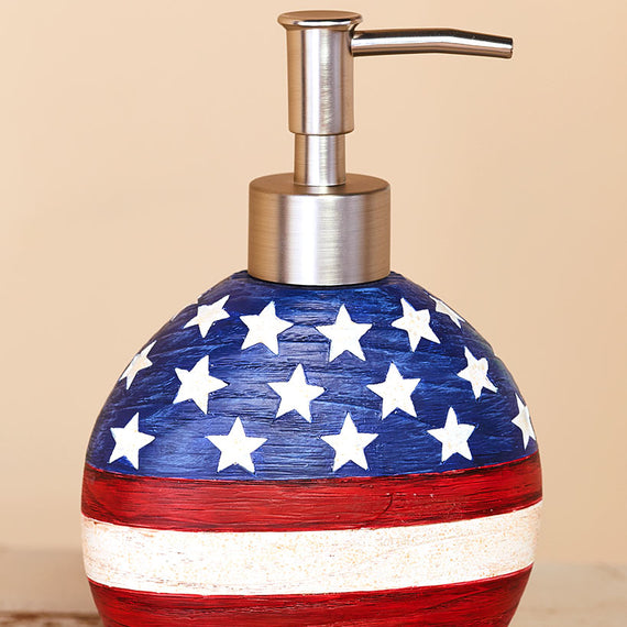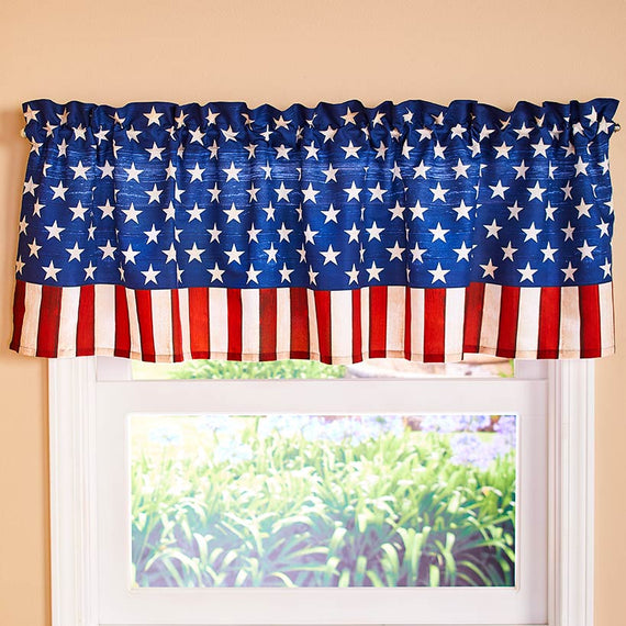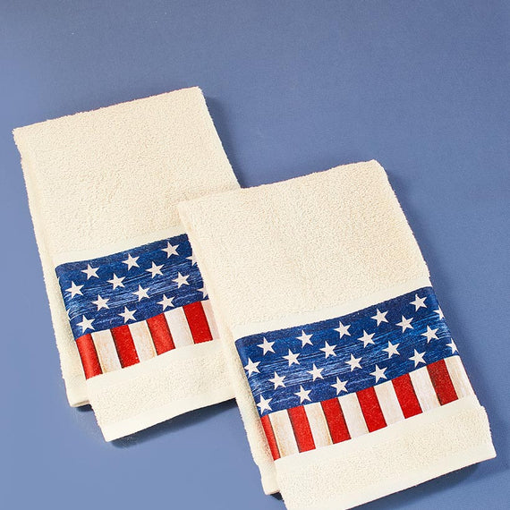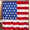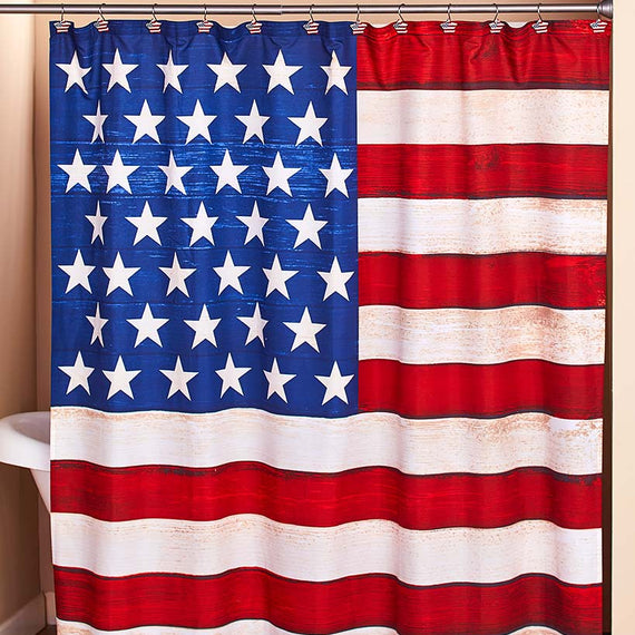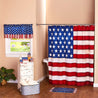 Show your patriotic spirit with this American Flag Bathroom Collection. It includes a Shower Curtain, Set of 12 Hooks, memory foam Rug with a nonslip backing, Set of 2 Hand Towels, Window Valance with rod pocket, Soap/Lotion Pump and Toothbrush Holder.