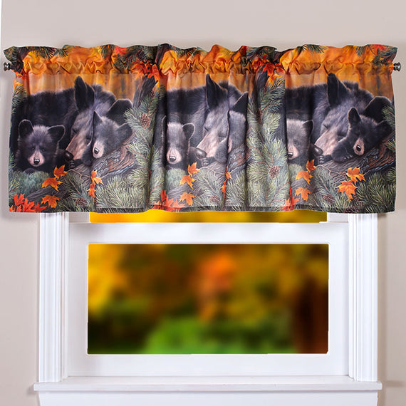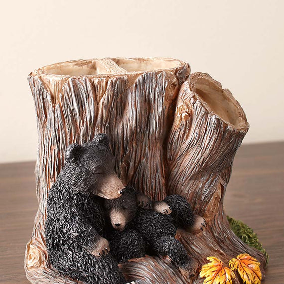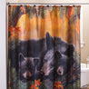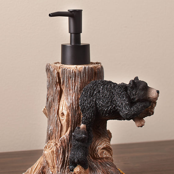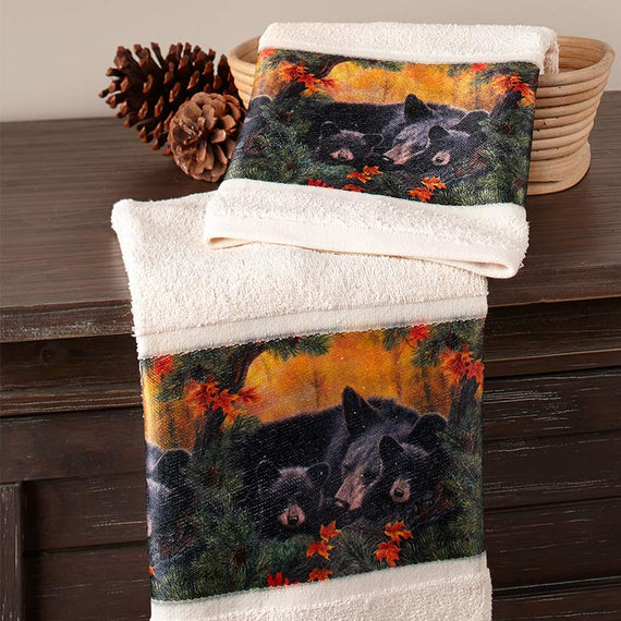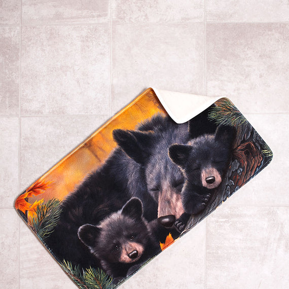 An adorable mother bear and her cubs are pictured in this Cozy Bears Bathroom Collection. The cold cast ceramic accessories feature carved designs. The Set of 12 Shower Hooks has 6 brown pine cones and 6 orange leaves, while the Soap/Lotion Pump and Toothbrush Holder are shaped like tree stumps. The Valance has a rod pocket. The Memory Foam Rug has a PVC backing for slip resistance. The collection also includes a Shower Curtain and Set of 2 Hand Towels.
