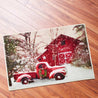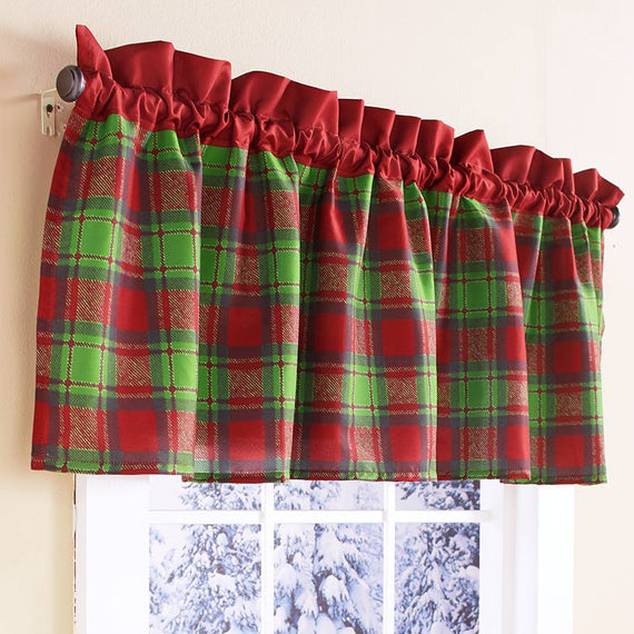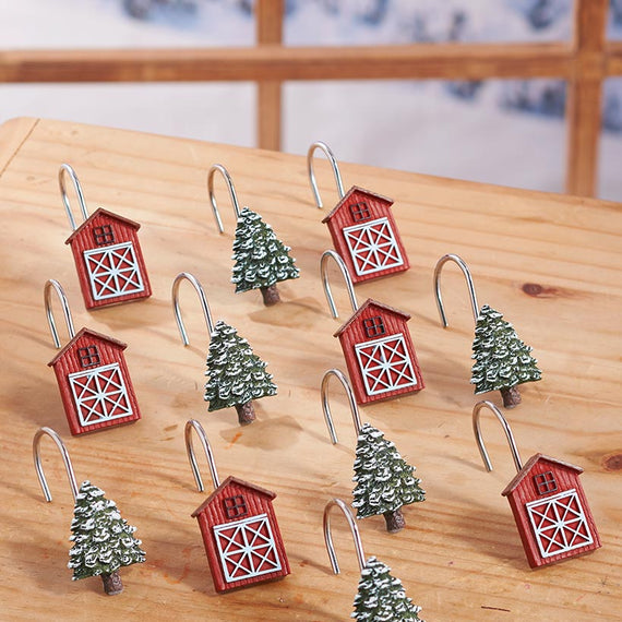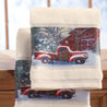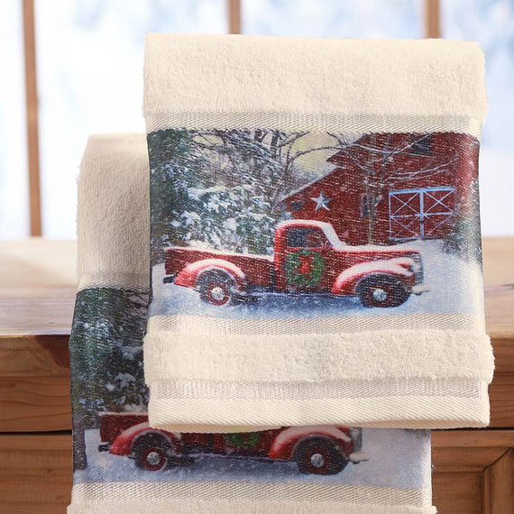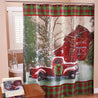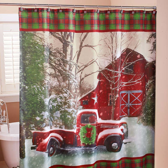 Bring your Christmas decorating into your bathroom with this Home for the Holidays Bathroom Collection. It features a snowy wooded scene with the classic red truck and barn, accented by a red and green plaid. Hang the Shower Curtain with the Set of 12 Shower Hooks. Drape the Set of 2 Hand Towels over a nearby towel bar. The Rug is backed with nonslip latex to prevent shifting. Use the rod pocket to hang the Valance.